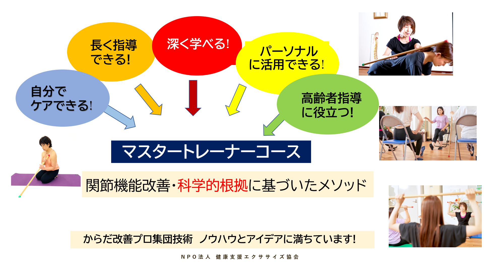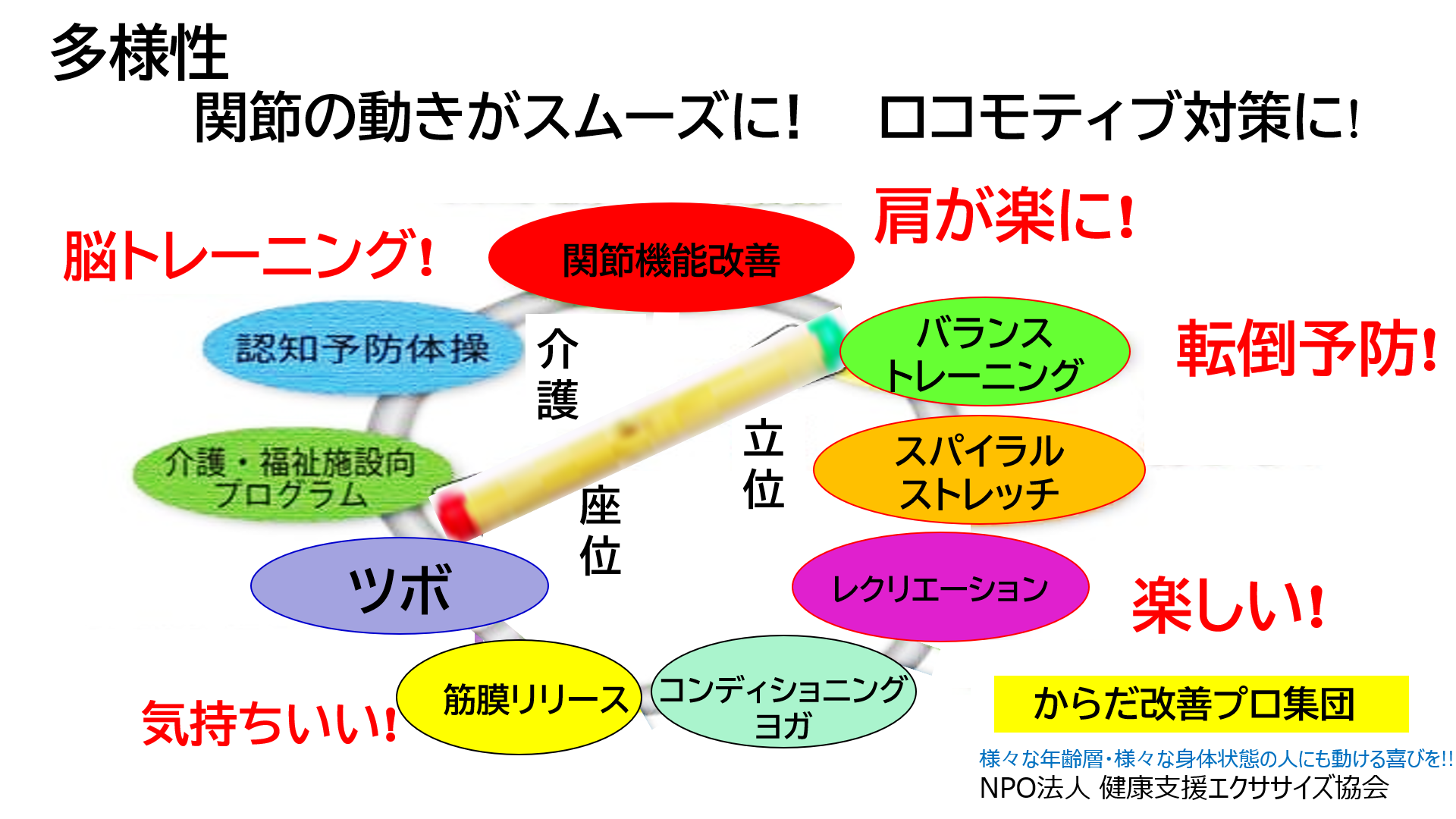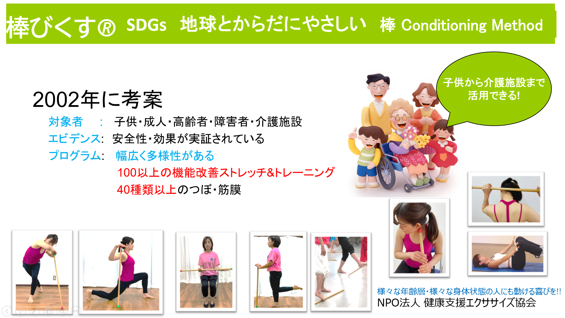 Functional Prop Conditioning(棒びくすⓇ)は、医師・研究者とともに開発された安全で効果的な楽しい関節機能改善プログラムです。水よりも自重をかけ、棒を使用することで関節障害部位の負担を少しでも軽減し、安心して効果的に運動できます。子どもから中高齢者、障害者、アスリートと幅広く対応が可能です。